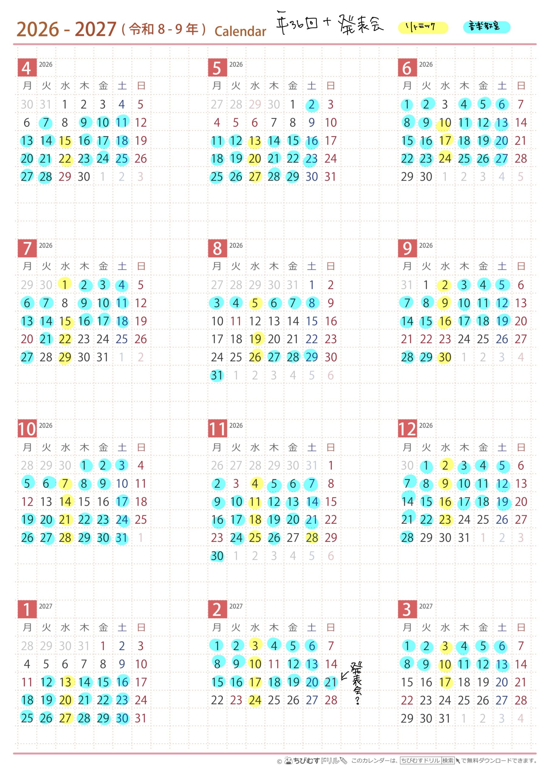 2026年度のレッスン予定 2026 3/02 お知らせ 目次2026年度のレッスン年間計画 2026年のレッスン計画です。学校の予定によって、少し変更になります。 水色が音楽教室です!黄色は保育園に行ってます♪ 時間割は現在調整中です。 お知らせ よかったらシェアしてね! URLをコピーしました! URLをコピーしました!